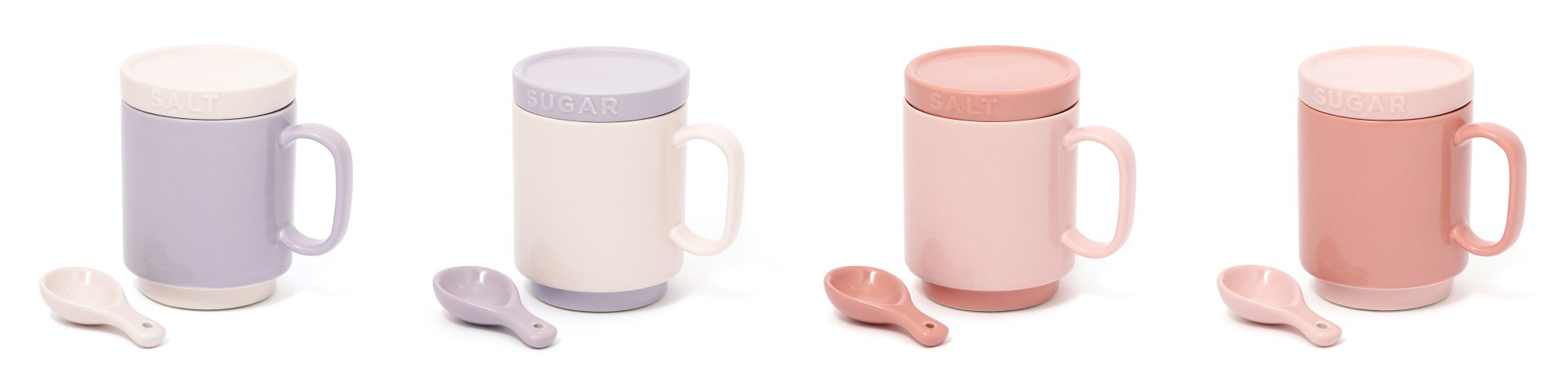 フタと本体で色を変えているバイカラーのキャニスターです。見た目で塩と砂糖が判断できるようにフタと本体のカラーを反転させました。スタッキングができるので省スペースで収納いただけます。小さじのスプーン付きです。