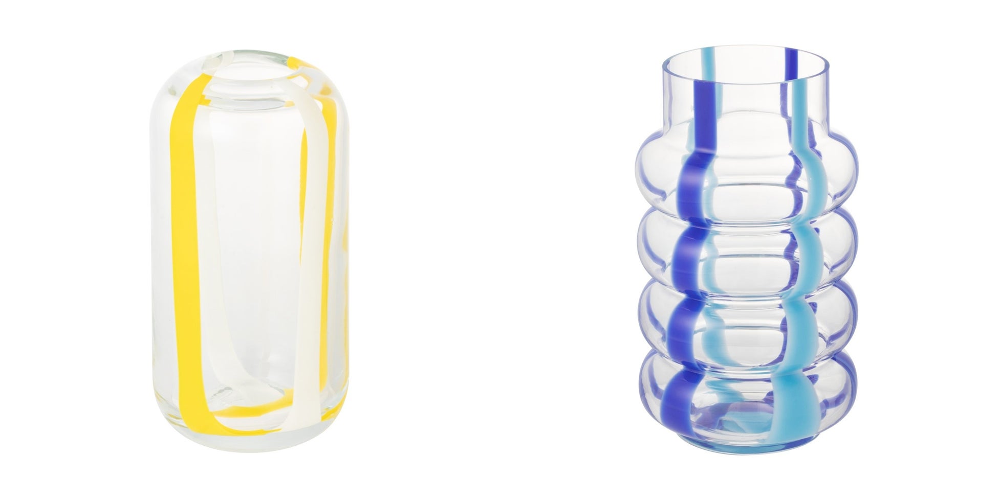 オブジェのようなクリアガラスに施したストライプ柄がポップな印象のフラワーベースです。柄と色のニュアンスが一つひとつ異なる一点ものです。ポピーやガーベラなどの色鮮やかなアートフラワーとの組み合わせがおすすめです。