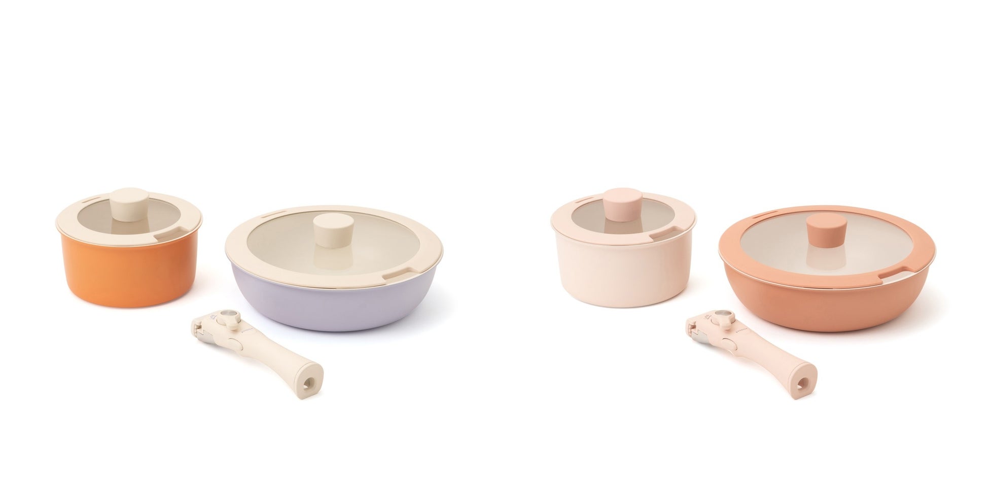 新生活のスタートにおすすめのフライパン・鍋セットです。取っ手はワンタッチで簡単に着脱でき、限られたスペースでも重ねて収納できます。食卓にそのまま出してもかわいいデザインで洗い物が減らせる点もポイントです。「蓋が欲しい」「取っ手を付けると蓋が浮いてしまう」といった既存シリーズへのお客様の声から、2種類のフライパンに使えるサイズの蓋を採用し、蓋に取っ手用の隙間を付けるなど、さらに日常使いしやすいよう改善しました。