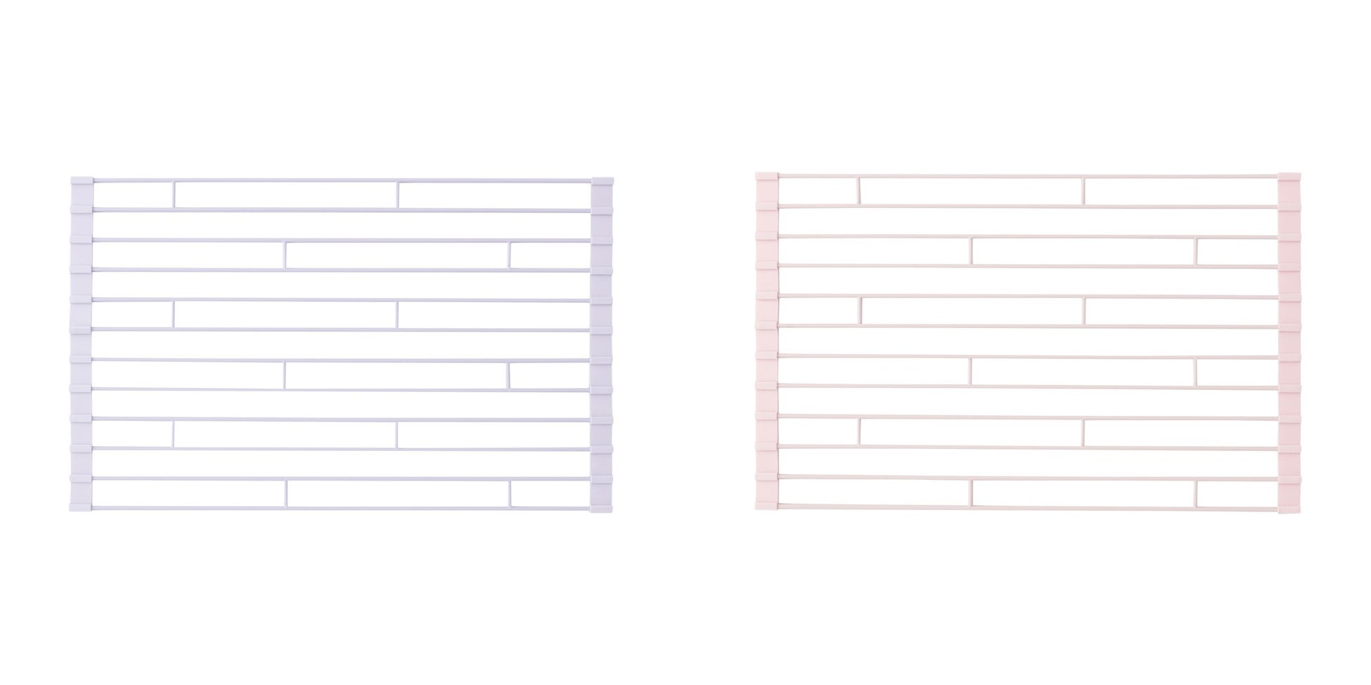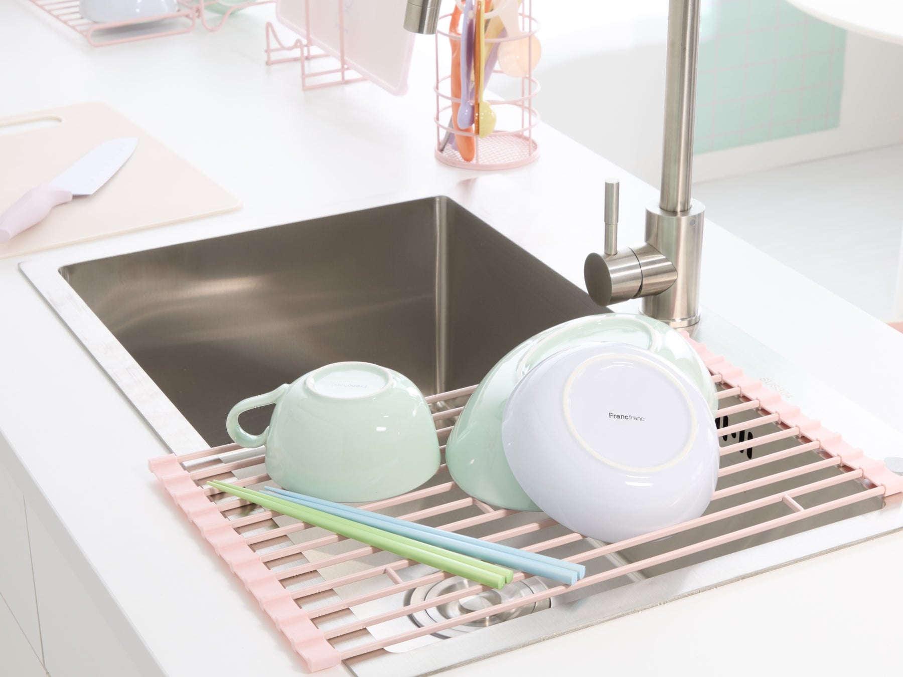 使わない時はクルっと巻いて収納できる省スペースで便利な水切りラックです。シンクスペースに合わせて丸めたり折りたたんだり、幅を調整できます。調理中のちょっとした作業スペースとして食材なども置くことができます。簡単に洗えるので清潔にお使いいただけます。