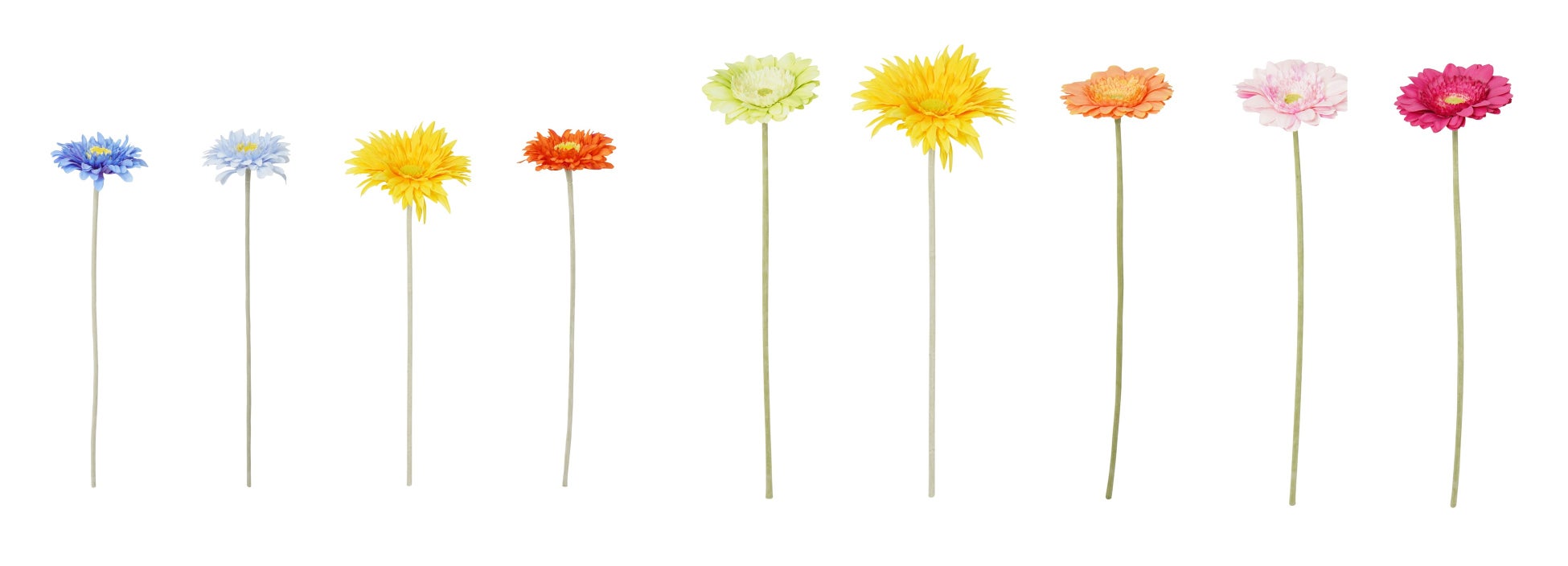 ガーベラのアートフラワーです。生花では表現できない美しい色合いをお手入れ要らずで楽しむことができます。茎を曲げて動きをつけると、よりトレンド感のあるアレンジを楽しむことができます。