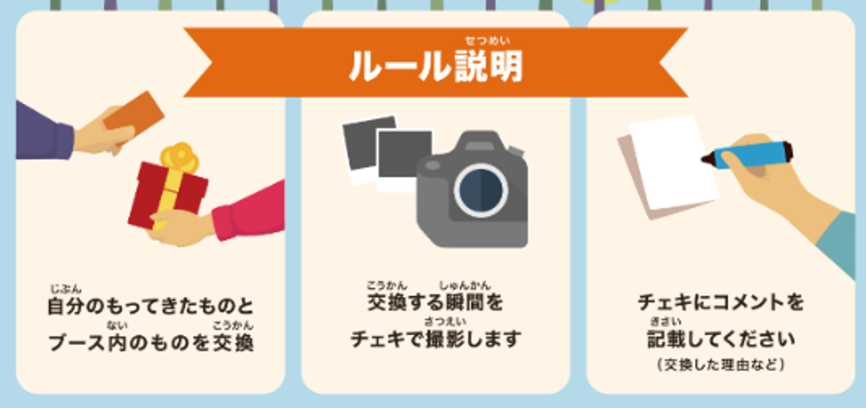 参加者には、「自分にとっては不要なもの」と「ブース内の素敵なもの」を交換し、「もの」のつながりを記録に収め、繋いだ「もの」の命の輪を広げていただきます。