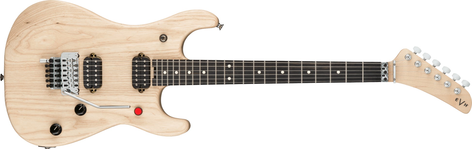- オールクロムのハードウェア、ヒールマウントのトラスロッド調整ホイール、EVH®ロゴのデカールが付いたホッケースティック型ヘッドストックにナチュラルステインフィニッシュ