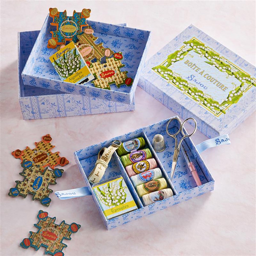 クラシカルで美しいデザインの手芸用品が人気の「サジュー」から、スズラン柄のソーイングボックスが登場。ハサミやメジャー、糸や糸巻きなど実用性の高いアイテムが入ったセットです。そのほかオリジナル生地や刺繍キット、刺繍糸、ピンクッションなどが揃います。