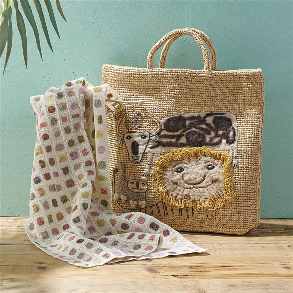 ファニーな動物たちを刺繍したかぎ編みのラフィアバッグと、さらりとした肌触りで夏場にも活躍するストール。ナチュラルな雰囲気のパリジェンヌルックにぴったりのアイテムです。