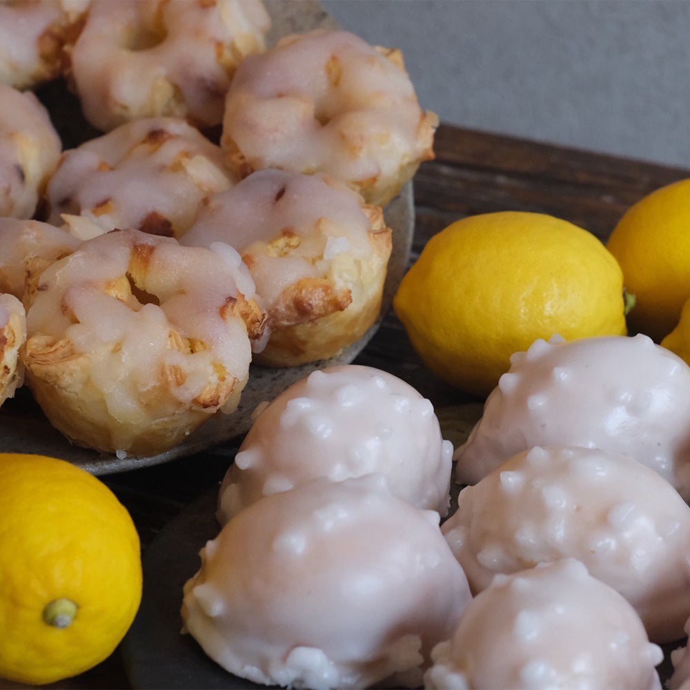 手前:レメのレモンケーキ〈各日50点限り〉651円、奥:もりの農園のレモンパイ〈各日50点限り〉551円(すべて日本製)