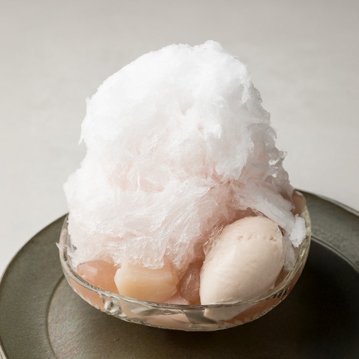 フランスで修行を積み、『ミシュランガイド東京』で一ツ星を獲得し続けている「レストラン ローブ」のパティシエ・平瀬 祥子氏が手がけるかき氷が登場。華やかに香る農薬不使用の薔薇のアイスクリームに桃のコンポートとロゼワインのわらび餅、ライチとヨーグルトのムースやジュレを合わせ、桃のシロップをかけた可憐な味わいの一品です。