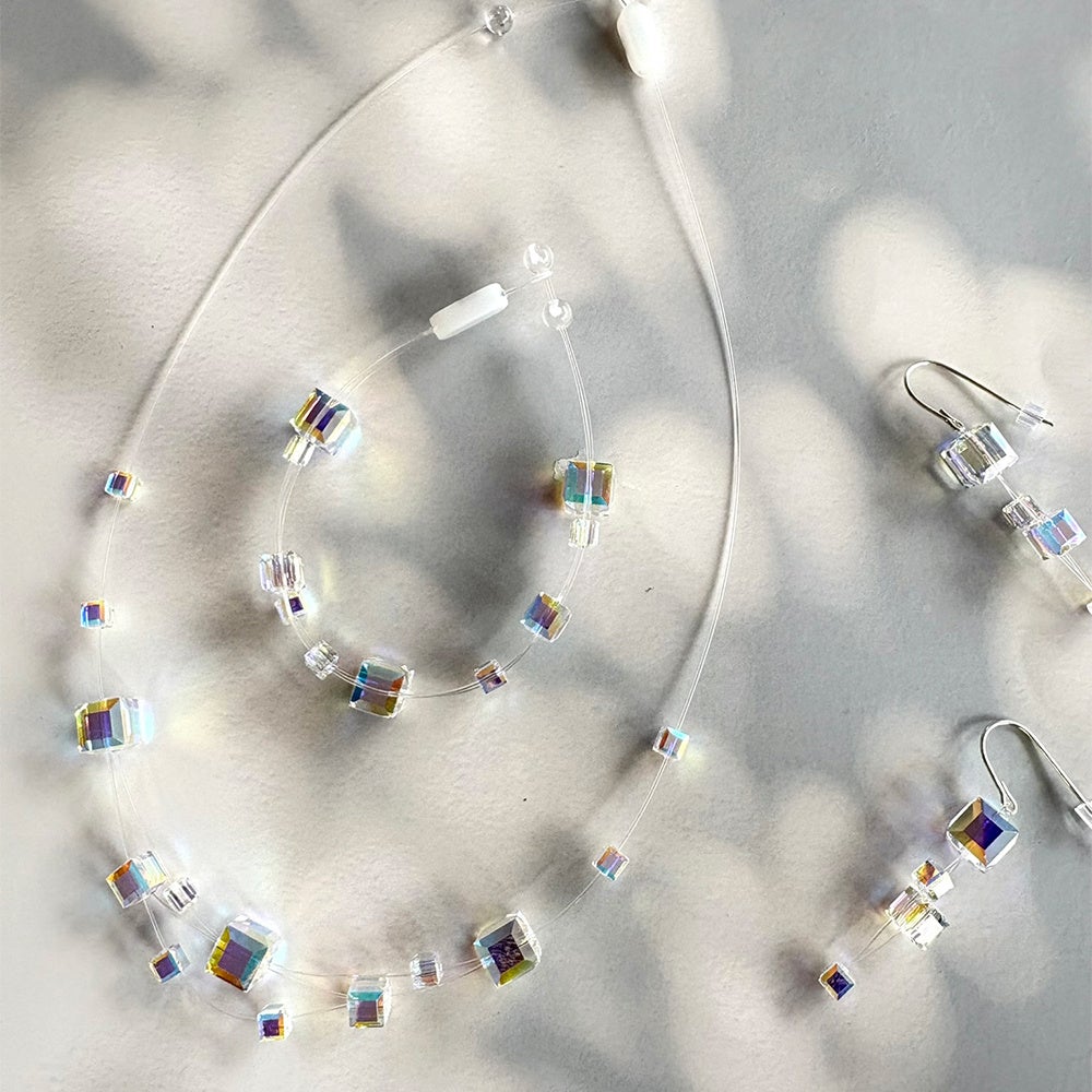 サイズの異なるオーロラカラーのクリスタルキューブが光を放つ、上品で洗練された印象のアクセサリー。クリスタルガラスの輝きが夏のリゾートファッションに華やかさをプラスします。