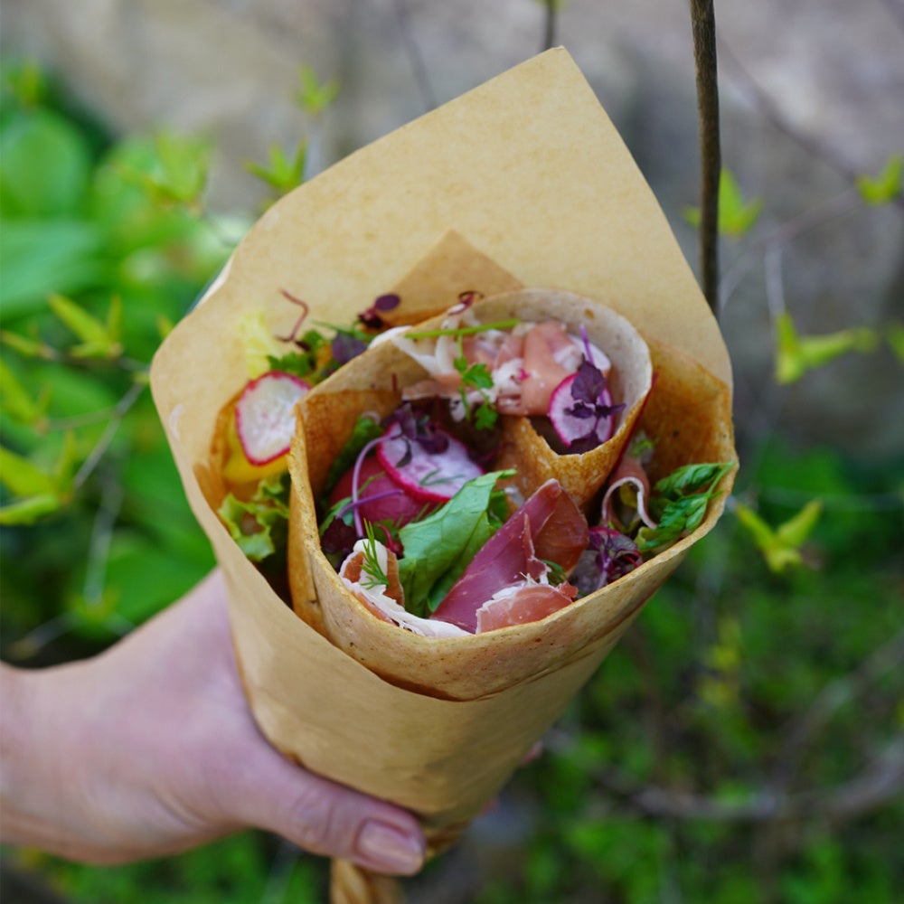 フランスのガレットコンクールで受賞経験のあるシェフ・櫻井 龍弥氏による兵庫県丹波篠山市のガレット専門店「SAKURAI」。定番のほか、新鮮な野菜とカリカリに焼きあげたソーセージに、シェフ自慢のバジルソースで夏らしく爽やかに仕上げたガレットを提供します。