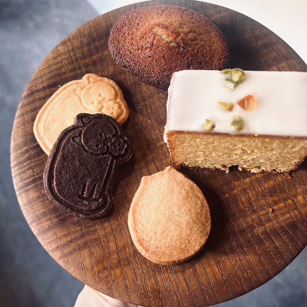 京都市壬生に店を構える「アンフルネ」。コーングリッツを混ぜた生地に甘酸っぱいアイシングをかけたレモンケーキや、焦がしバター入りのフィナンシェ、ねこのデザインがかわいいサブレなどの焼き菓子が並びます。