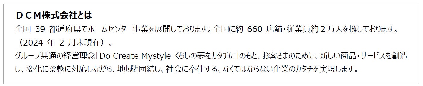当社は、経営理念である「Do Create Mystyle くらしの夢をカタチに」のもと、お客さまのために、新しい商品、新しいサービスを創造してまいります。その取り組みのひとつとして専門店ECをオープンしました。今後も様々な商品カテゴリーの可能性を模索し、サービスの拡充に取り組んでまいります。