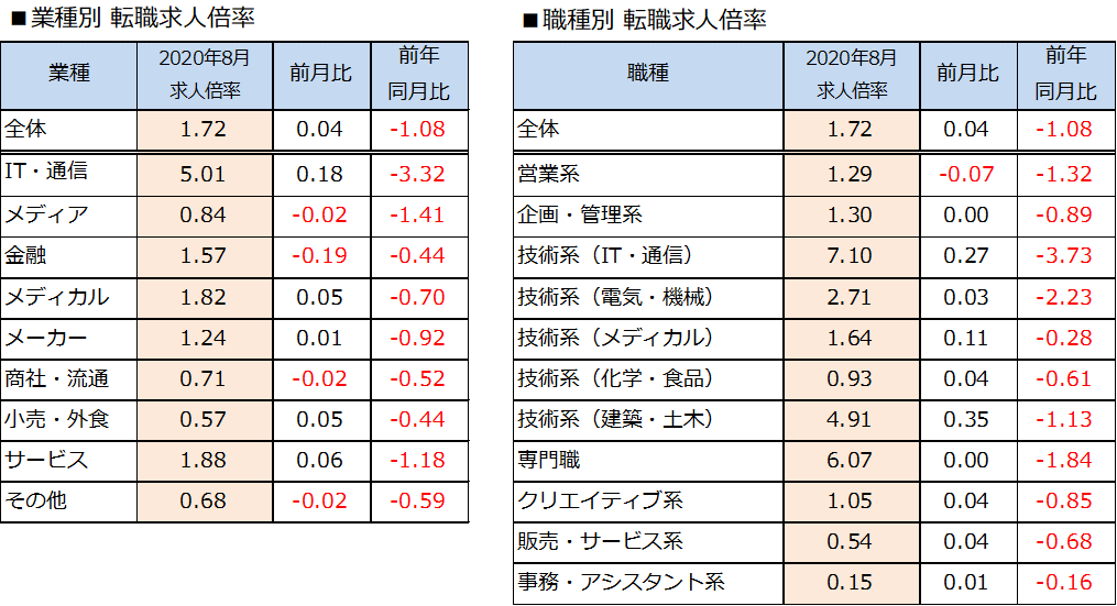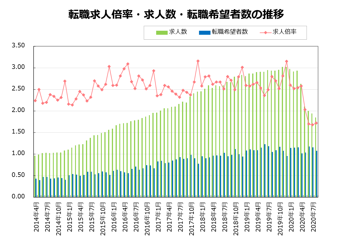 2020年8月の転職求人倍率は、前月比+0.04ポイントの1.72倍となりました。求人数は前月比95.3%、前年同月比63.2%となりました。転職希望者数は前月比93.3%、前年同月比103.0%でした。