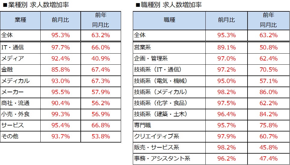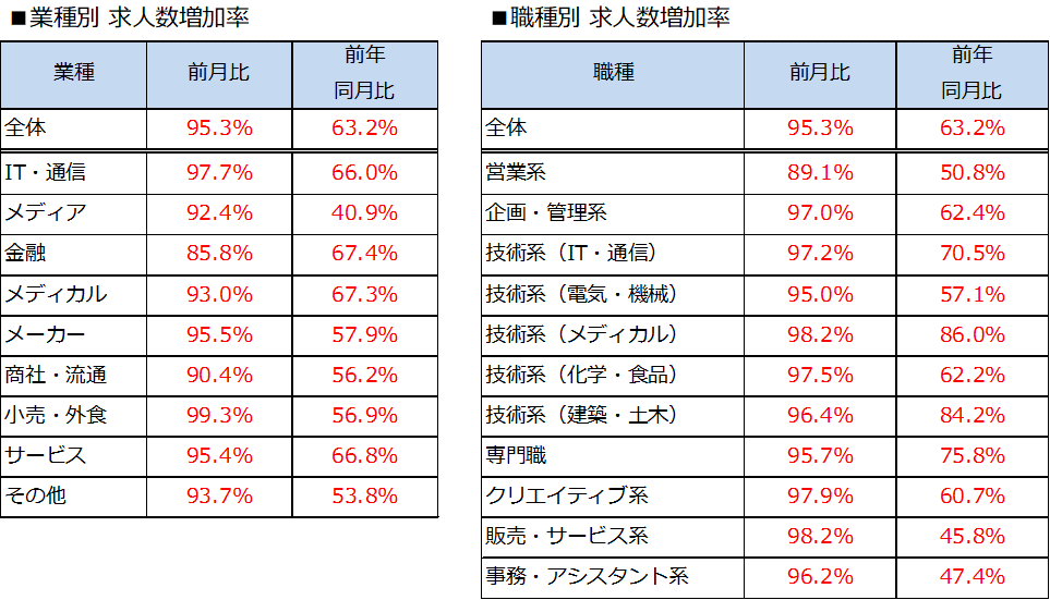 業種別では、すべての業種で求人数が減少しました。求人の減少率が最も低かったのは、「小売・外食」(前月比99.3%)、次いで「IT・通信」(前月比97.7%)となりました。職種別でも、11職種すべてで求人数が減少しました。求人の減少率が最も低かったのは、「技術系(メディカル)」(前月比98.2%)、「販売・サービス系」(前月比98.2%)、次いで「クリエイティブ系」(前月比97.9%)でした。