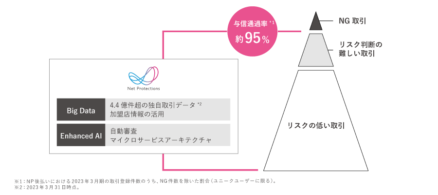 業界最大手である当社は、後払い決済で最も重要な指標である”与信力”に定評があります。後払い決済は、与信審査を厳しくしすぎると事業者様の売上向上メリットが少なくなりますが、緩くしすぎると不正取引を検知できず、未回収率のコントロールが難しくなりサービス品質の維持が難しくなります。また、商品の転売等によるブランド毀損をマーチャント様に引き起こします。