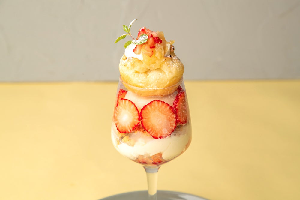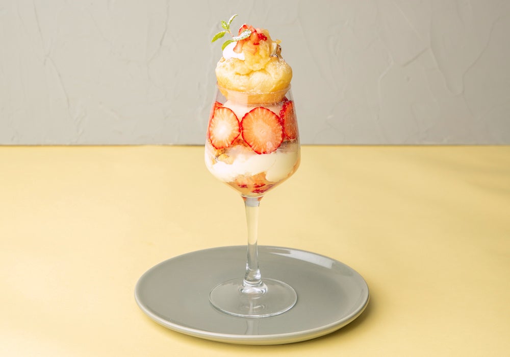 旬の苺で華やかに彩られたパフェに、桃とチーズを使ったサクサク食感のパイを盛り付けました。パイをくずしながらパフェと一緒に食べれば、フレッシュで爽やかなフルーツの甘みと甘じょっぱいチーズの味わいが広がります。
