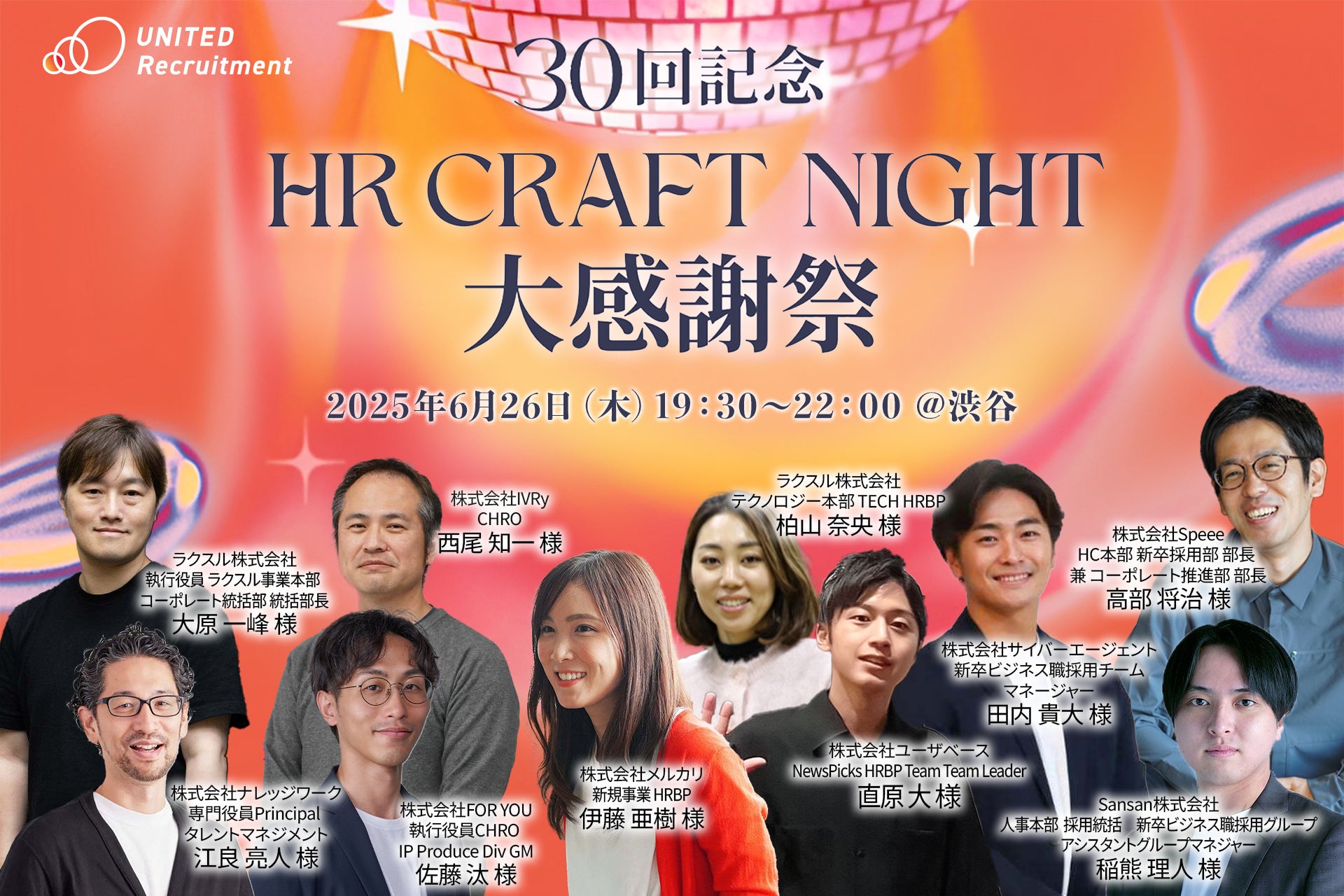 HR領域の注目人材が集う、企業人事交流イベント「HR Craft Night 30回記念 大感謝祭」新卒採用セッション登壇者決定