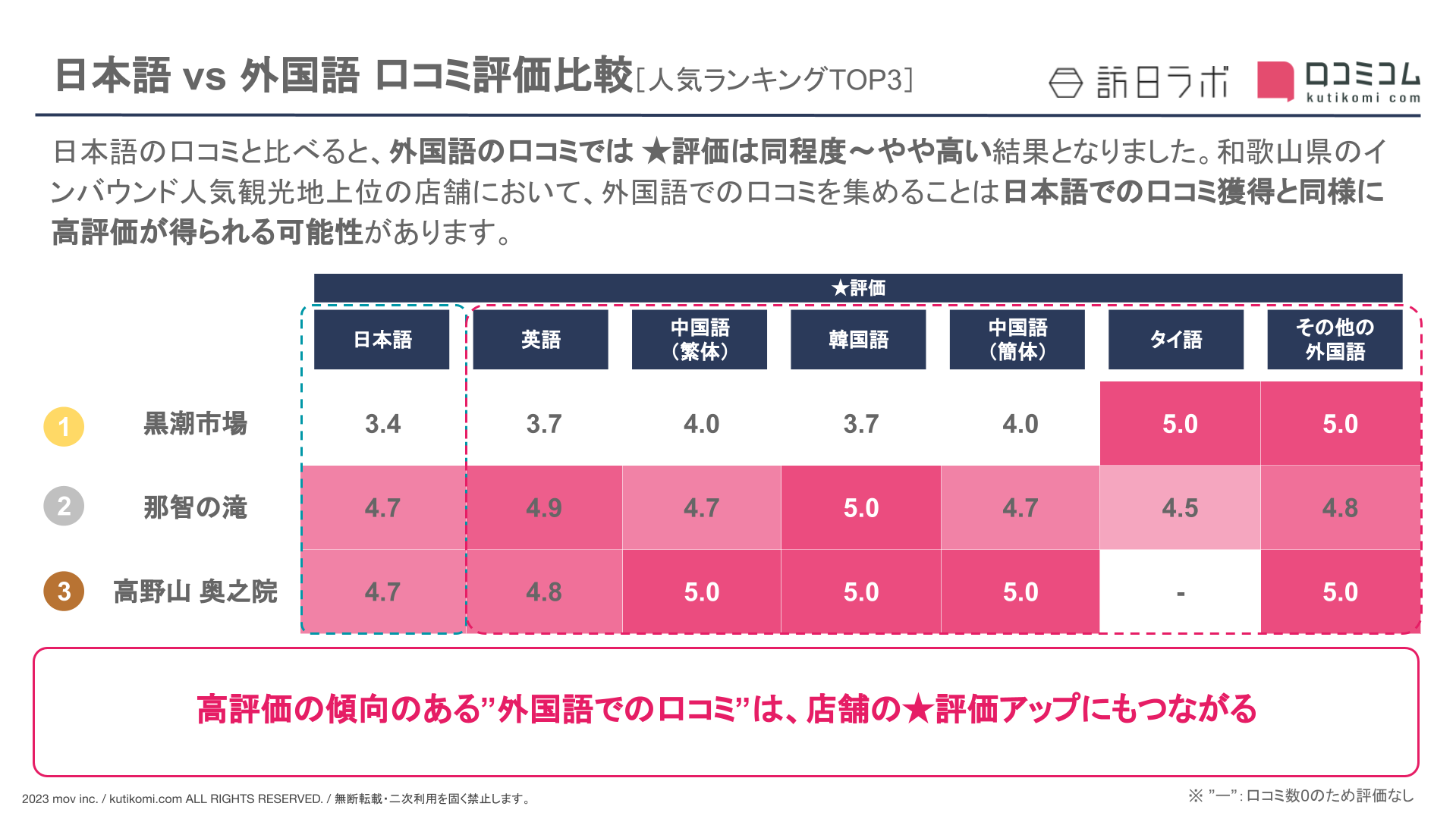 日本語の口コミと比べると、外国語の口コミでは ★評価は同程度〜やや高い結果となりました。和歌山県のインバウンド人気観光地上位の店舗において、外国語での口コミを集めることは日本語での口コミ獲得と同様に高評価が得られる可能性があります。