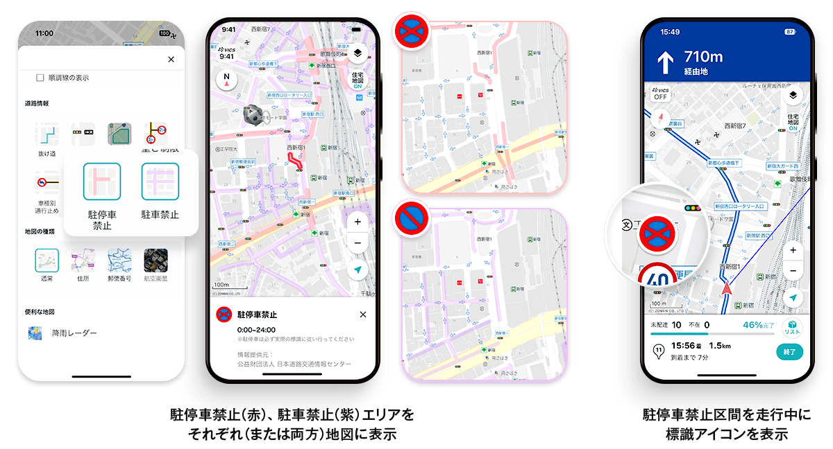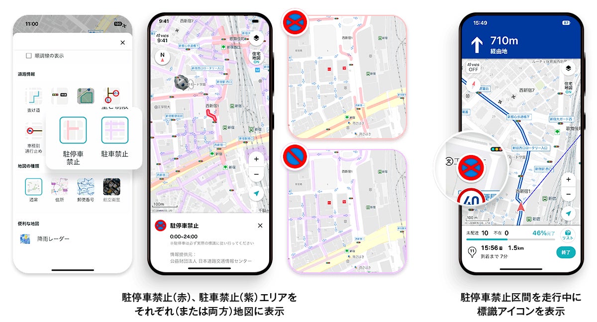 本機能で、「駐車禁止・駐停車禁止」場所を視覚的に把握するとともに、2024年7月に提供開始した、貨物集配中の「荷さばき地点」表示機能などと組み合わせてご利用いただくことで、法令順守と円滑な配達業務をサポートし、スムーズな物流に貢献できればと考えております。