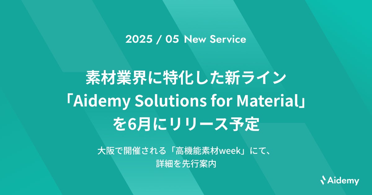 デジタル変革に伴走する株式会社アイデミー(本社:東京都千代田区、代表取締役 執行役員 社長 石川聡彦、以下「アイデミー」)は、2025年6月1日にリリース予定のAIシステム開発「Aidemy Solutions(※)」の新ラインとして、素材業界の業務を変える 次世代AIサービス「Aidemy Solutions for Material(AS4M)」を同時に正式リリースすることを決定いたしました。