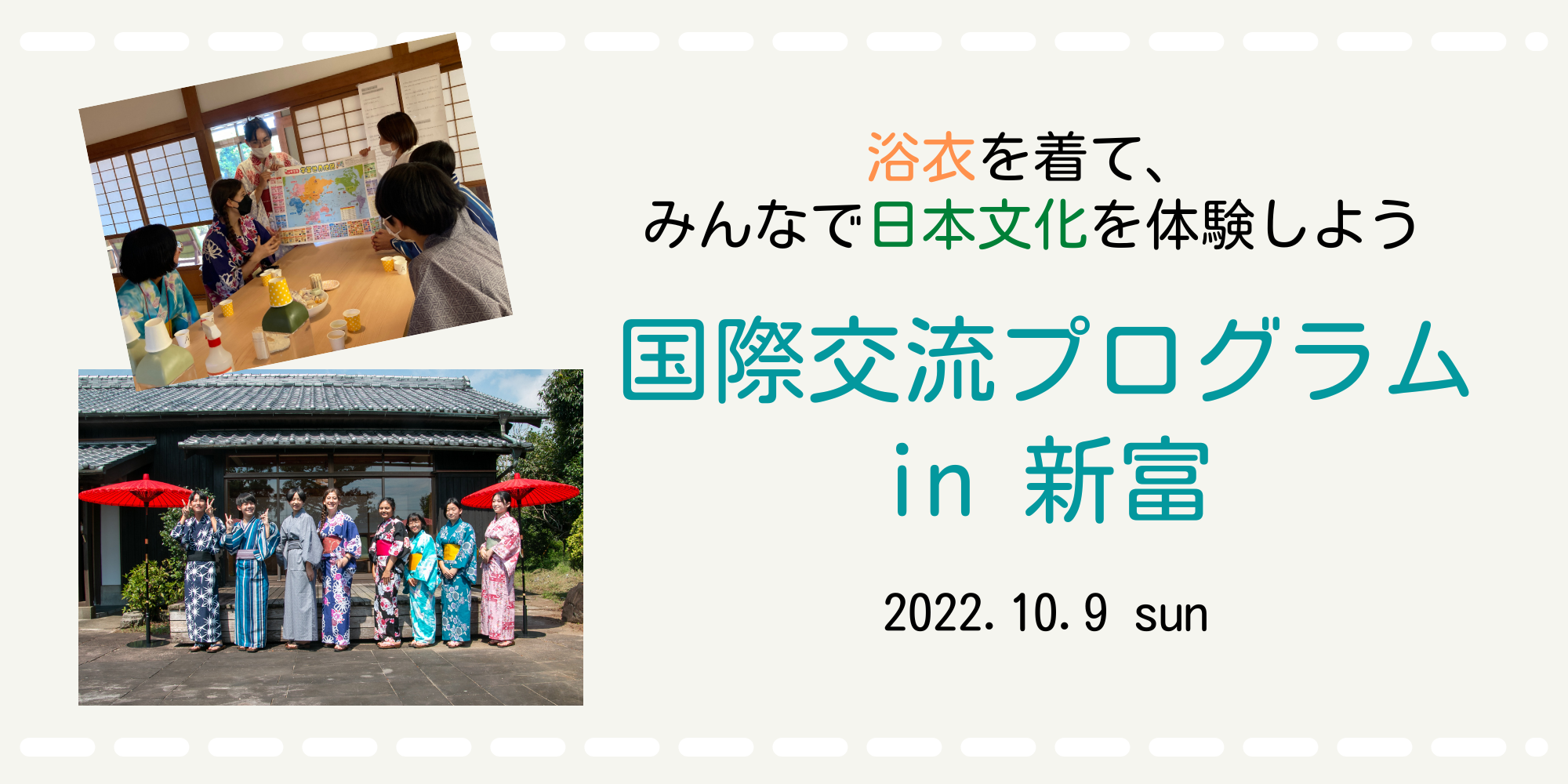 | 【プログラム概要】 タイトル:国際交流プログラム in 新富 日 時:2022年10月9日(日) 8:30〜13:00 会 場:一棟貸切宿 茶心(https://tea-hotel.com/) 〒889-1406 宮崎県児湯郡新富町新田15499番地2 参加費 :無料 参加対象:①新富町内在住外国人 ②町内中学生、県内高校生 ※お申込みはすでに終了しています <当日のスケジュール> 8:30 新富町役場集合→会場へ移動 9:00〜12:00 浴衣の着付け体験・国際交流など 12:30〜13:00 終了→新富町役場へ移動、解散 |