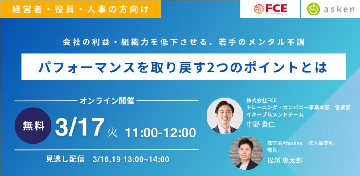 株式会社FCE(東京都新宿区、代表取締役社長:石川淳悦、証券コード:9564)は、 AI食事管理アプリ『あすけん』を開発・運営する株式会社asken(本社: 東京都新宿区、代表取締役社長:中島 洋)と、経営者・人事向けオンライン無料セミナー「会社の利益・組織力を低下させる、若手のメンタル不調。 パフォーマンスを取り戻す2つのポイントとは」を開催いたします。