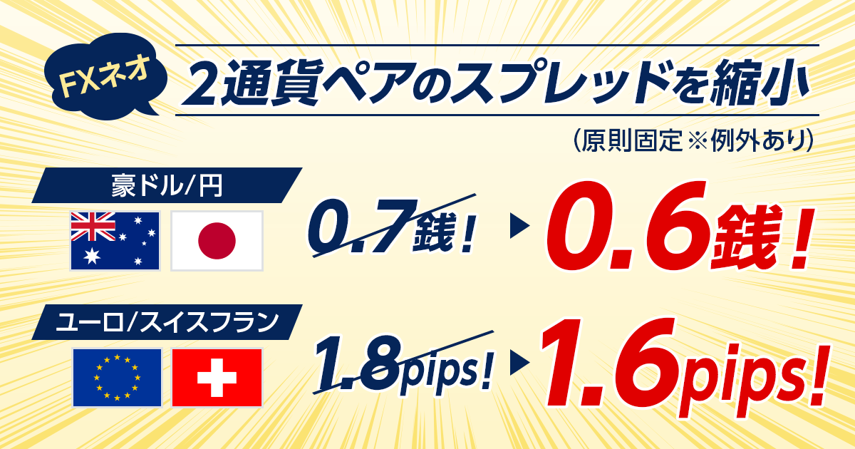 ~本日16時より豪ドル/円0.6銭、ユーロ/スイスフラン1.6pipsにスプレッドを縮小!~