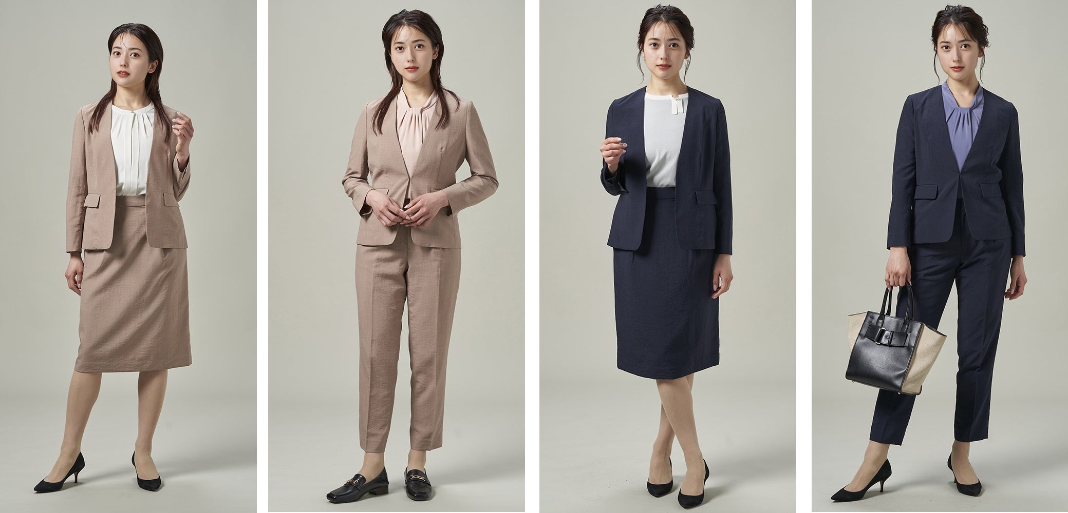 このたび新たに展開を開始するオンラインショップ限定デザインセットアップは、夏らしい麻ライクの肌触りとすっきりとしたデザインが春夏のビジネスシーンにオススメの一着です。同生地を採用した店舗限定デザインと併せて組み合わせ自由に多様なスタイリングをお楽しみいただけるセットアップとなっております。ベーシックで毎日のスタイリングに取り入れやすいネービーと、トレンドを取り入れたナチュラルなベージュ系カラーの2色展開です。