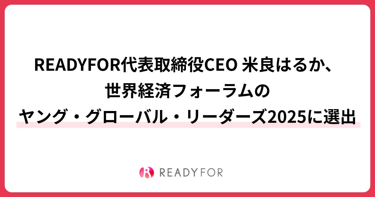 日本初・国内最大級のクラウドファンディングサービス「READYFOR」を運営するREADYFOR株式会社(所在地:東京都千代田区、代表取締役:米良はるか、以下「READYFOR」)は、このたび当社代表取締役CEOの米良はるかが、世界経済フォーラム(World Economic Forum)が選出する2025年度「ヤング・グローバル・リーダーズ(YGL)」に選出されたことをお知らせいたします。