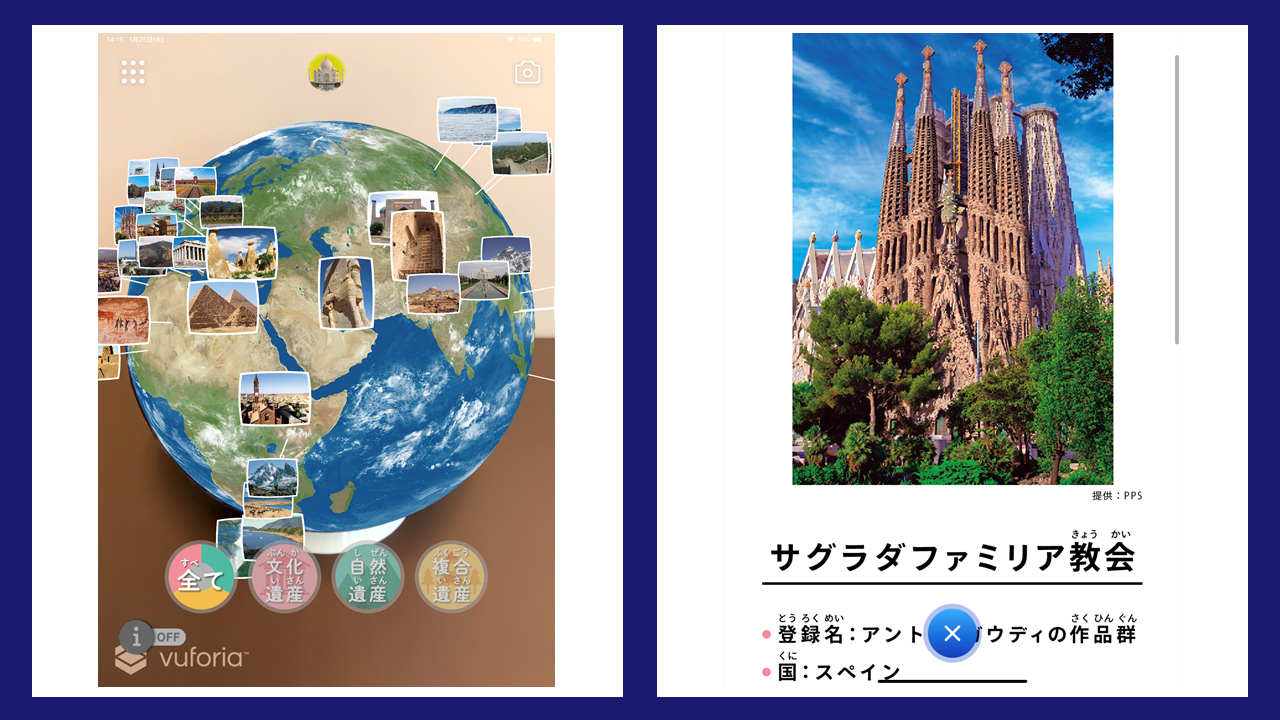 ○地球儀上の世界遺産の写真をタップすれば、詳しい情報が見られます。
