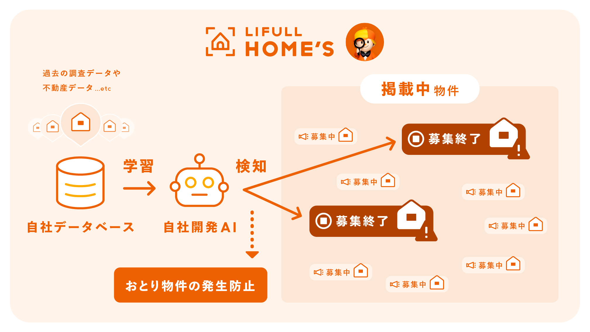 この取り組みは、LIFULLのデータベースに蓄積されている過去に広告掲載された物件情報や、独自調査による募集状況の情報などを自社で開発したAIに学習させ、「おとり物件」を検知させるものです。