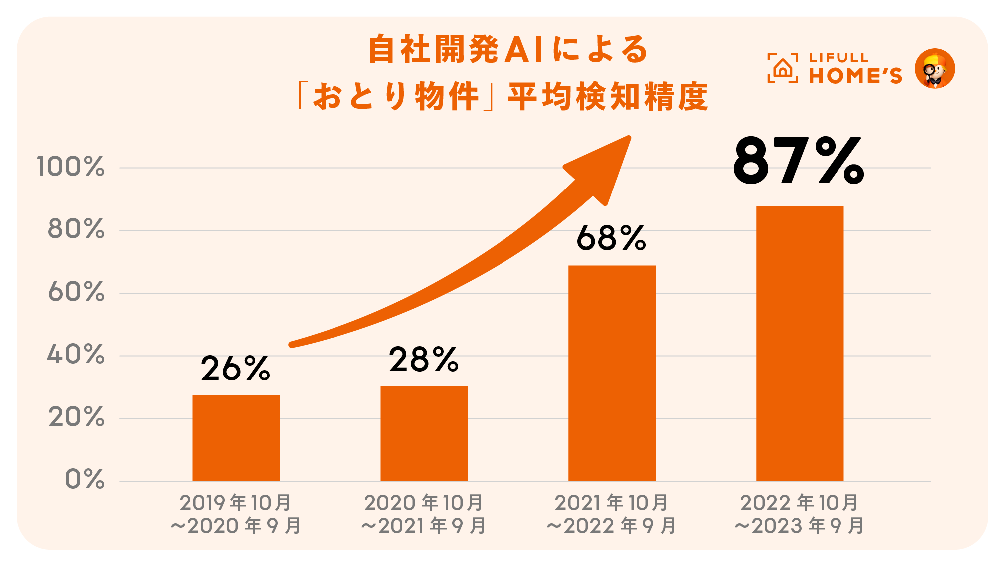 自社開発AIの検証を開始した2019年10月から2020年10月時点までは、「おとり物件」の検知精度は月あたり平均26%程度に留まっていました。以降、複数の学習モデルを考案の上で並行して検証を行ったところ、2022年10月以降の検知精度は月あたり平均87%まで向上し、2023年3月単月では特定の学習モデルでの検知精度が99%になるなど、非常に高い結果が出ている状況です。