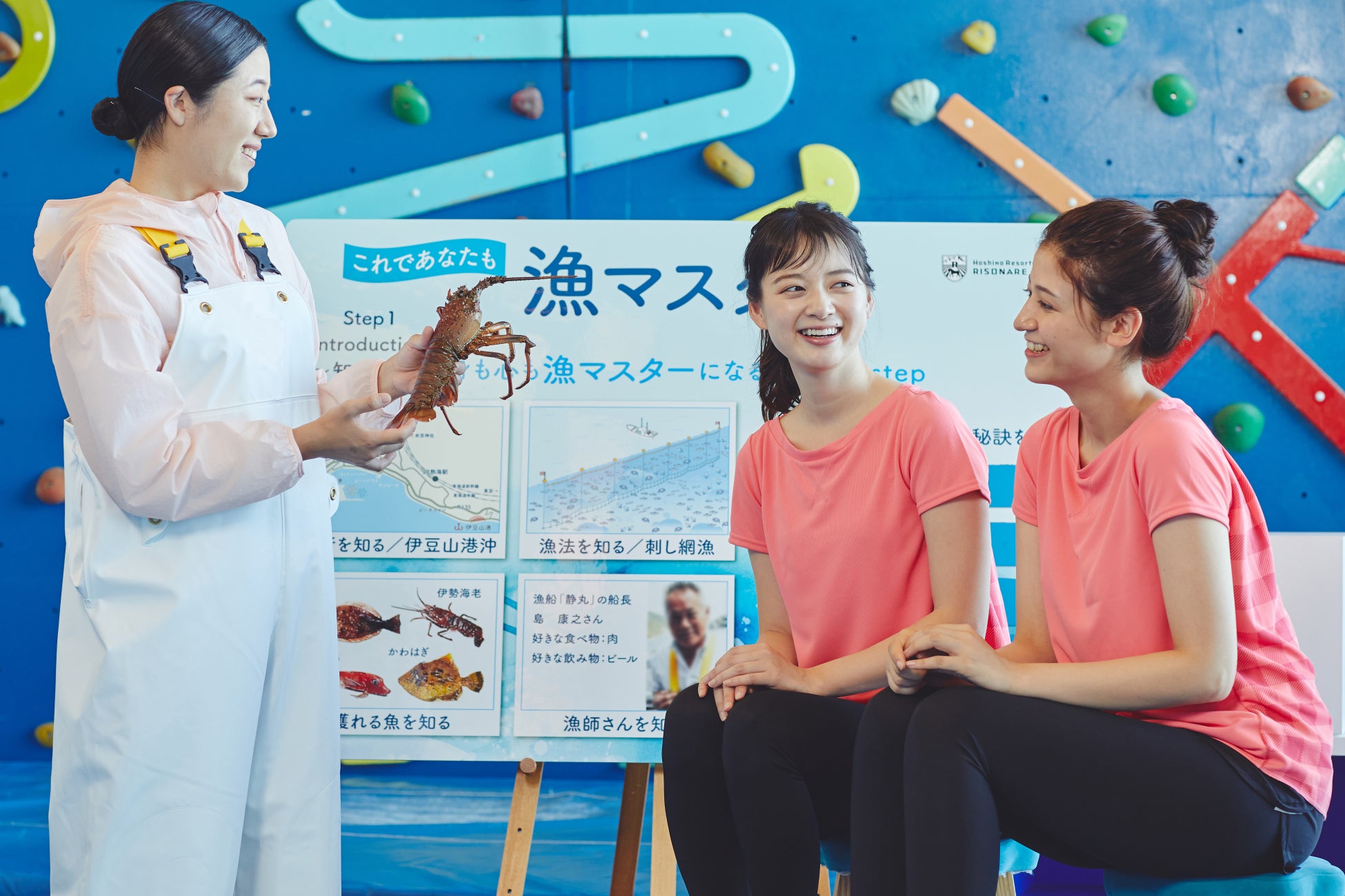 漁体験の前日は、漁に向けて準備をします。漁師から知識を伝授されたスタッフからのレクチャーでは、伊勢海老の雄と雌の見分け方や脚の本数など、マメ知識を得ることができます。レクチャー後は、漁を連想させるようなエビのポーズでストレッチを行う時間です。身体をほぐし、早朝からの漁に備えます。また、「和食ダイニング 花火」での夕食では、魚介中心の会席料理を味わい、乾杯酒の「海風土(シーフード)」で気分を盛り上げます。