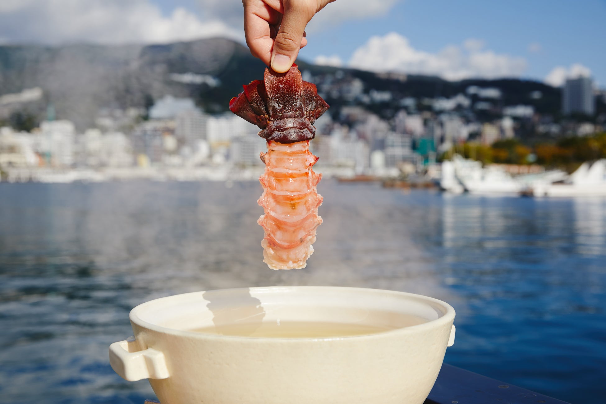 漁の後は獲れたての伊勢海老を使って、港でしゃぶしゃぶを堪能します。伊勢海老と昆布で出汁をとり、そこにプリプリの身をくぐらせて食べると、口の中に旨味が広がります。さらに、伊勢海老を堪能できるよう3種類の調味料を用意。その中でも静岡県にちなんだ橙を使ったポン酢は、程良い酸味が伊勢海老の甘味を引き立てます。シメには雑炊を作って、伊勢海老を存分に味わい尽くします。