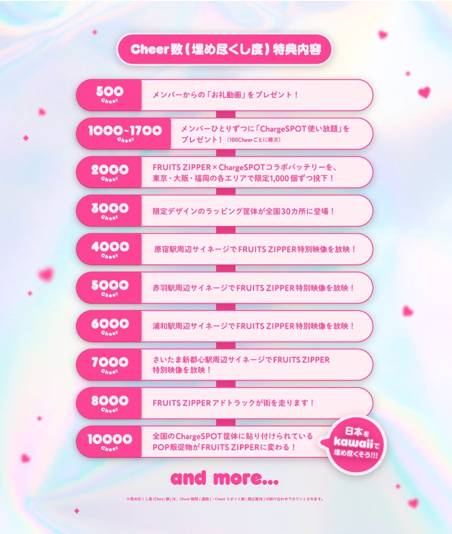 ・1000〜1700 Cheer達成:FRUITS ZIPPERメンバーひとりずつに「ChargeSPOT 使い放題」をプレゼント(100Cheerごとに順次)
