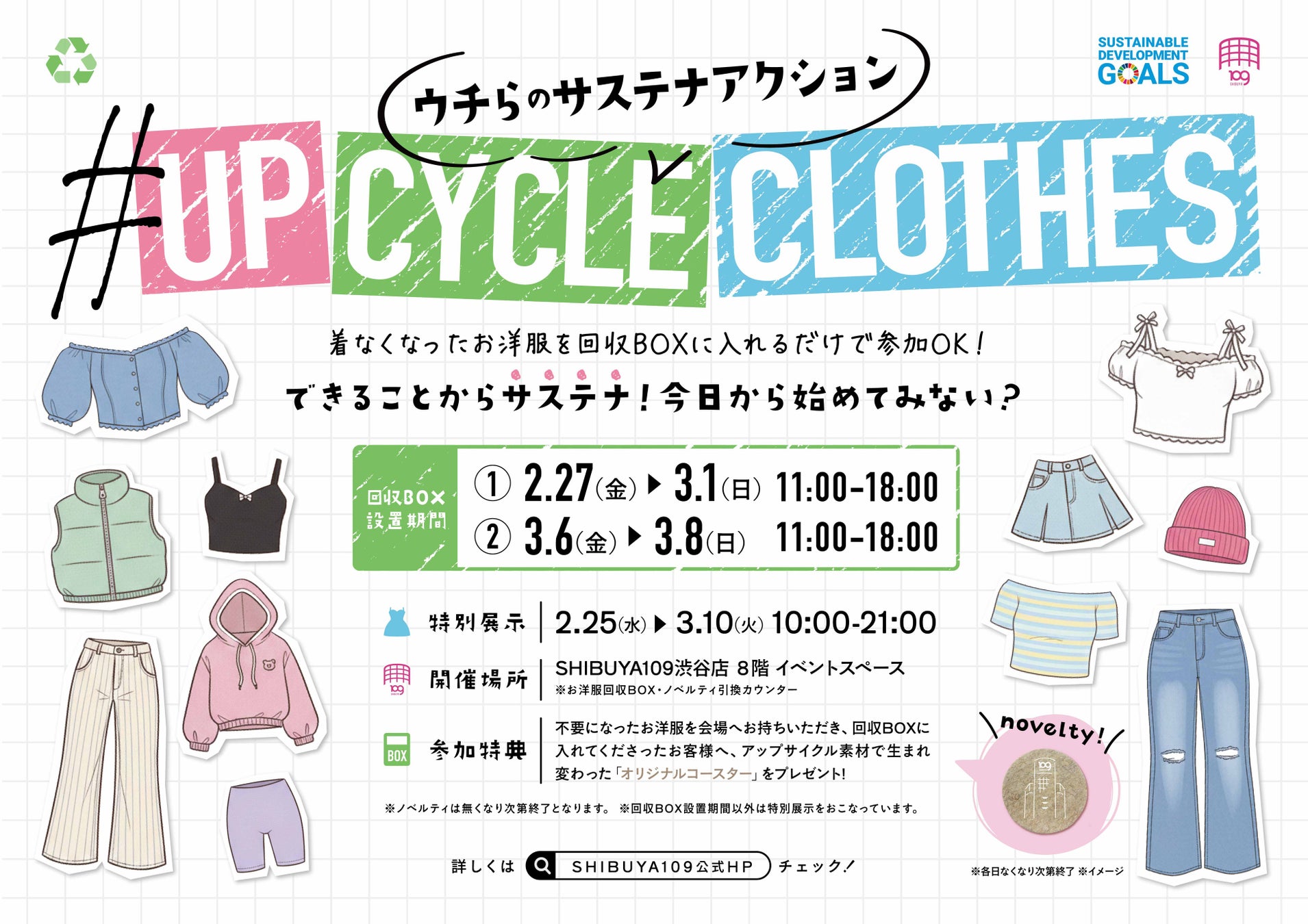 株式会社SHIBUYA109エンタテイメント(本社:東京都渋谷区、代表取締役社長:石川 あゆみ)は、サステナブルな未来の実現に向けた取り組みの一環として、2月27日~3月1日/3月6日~8日の6日間、SHIBUYA109渋谷店館内特設スペースにてアップサイクルプロジェクト「#UP CYCLE CLOTHES」を開催いたします。