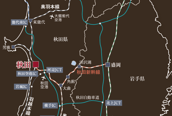 能代方面や横手方面へつながる国道や青森自動車道「秋田中央IC」(約5.2km)へもスムーズ。観光やレジャー、ビジネス、ドライブなど快適なカーライフが実現します。