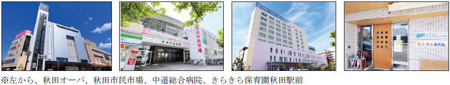 本物件が位置する秋田市では2008年より「秋田市中心市街地活性化基本計画」を実施。活力あるまちづくりを実現するため、都市機能を集約したコンパクトシティ化を推進しています。アクセス拠点である駅を中心に、商業・文化・医療・教育などの機能を集中させる積極的な再開発が行われており、秋田駅前中心市街地は未来に向け、より機能的に美しく発展しております。