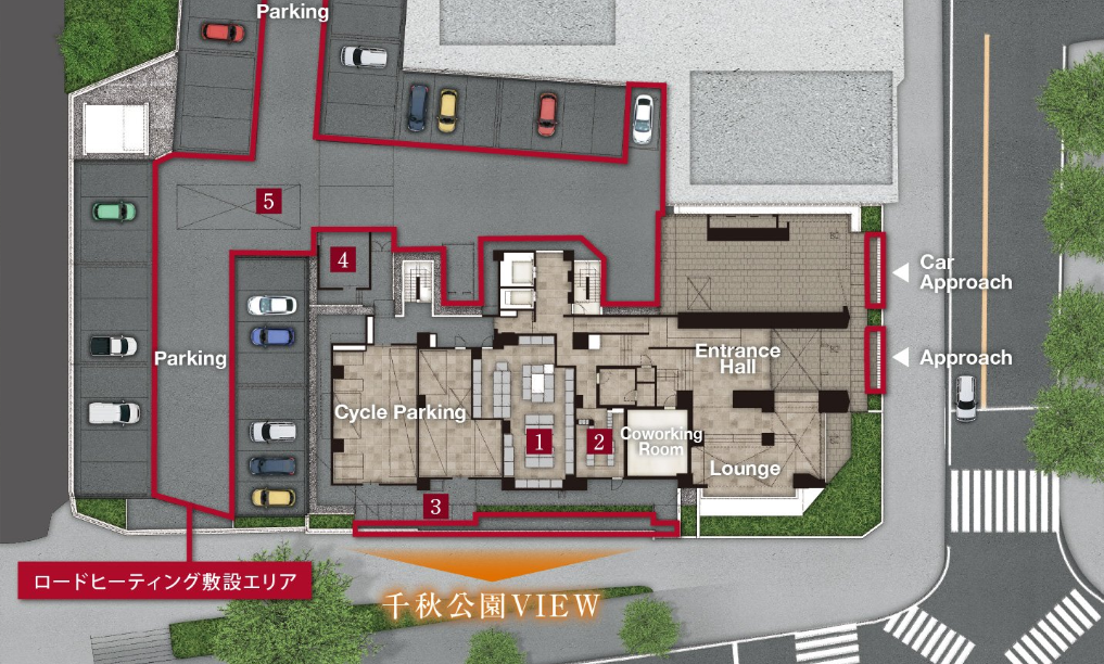 駅近立地でありながら、敷地内に全邸分以上となる134台分(内、来客用2台)の駐車場をご用意。スムーズでスマートなカーライフを実現します。