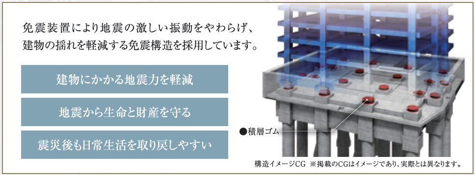 地震のエネルギーを分散し、大きく長い揺れを低減する免震装置を基礎部分に設置。建物の揺れが静かなことが特徴です。免震構造は水平方向には柔軟に動くため、地震の激しい振動をやわらげ、建物の揺れを長周期化します。