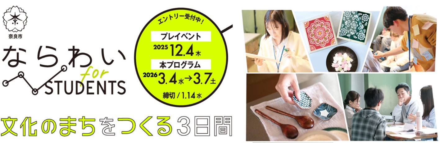 若者世代の活躍を応援する奈良市では、学生が奈良の企業の新規事業(なりわい)に挑戦する短期集中プログラム「ならわい for students ~文化のまちをつくる3日間~」を実施します。このプログラムは、「起業したい」「地域と関わりたい」「奈良をもっと面白くしたい」そんな学生の中にある想いを形にする、3日間のプログラムです。各企業からのお題に対して、学生が5人一組のチームを組み、3日間で新たな企画を提案します。3月の本プログラム開催にあたって、12月4日(木)に募集説明会を兼ねたプレイベントを実施します。
