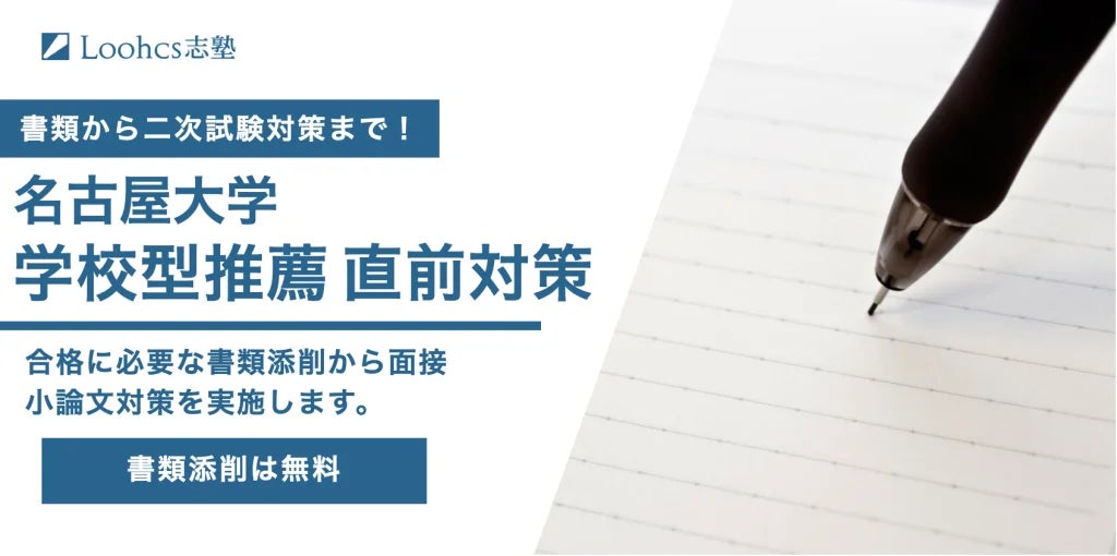 ルークス志塾名古屋校(名駅校)・千種校は、名古屋大学の学校型推薦に挑む受験生に向けて、志望理由書・口頭試問・小論文を強化する直前対策講座を実施します。名大が重視するポイントを踏まえた添削と模擬面接により、短期間で合格に必要な準備を仕上げることが可能です。12月入塾者には入塾金無料の早期特典も用意し、名大合格を力強く後押しします。