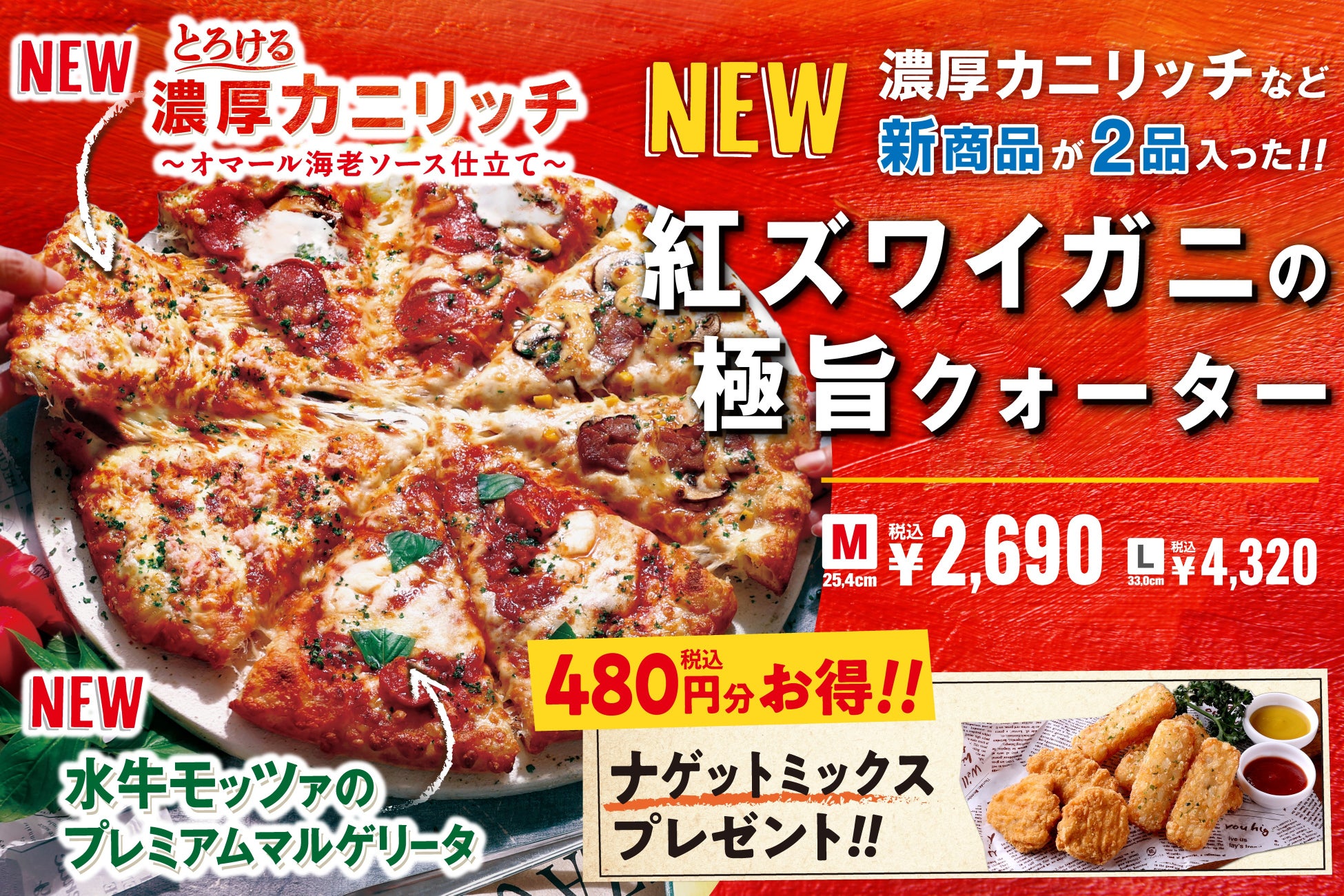 さらに『紅ズワイガニの極旨クォーター』をご注文いただくと「ナゲットミックス」または「お好きなドリンク(ピザMサイズで2本・Lサイズで3本)」がもらえるキャンペーンも実施します。