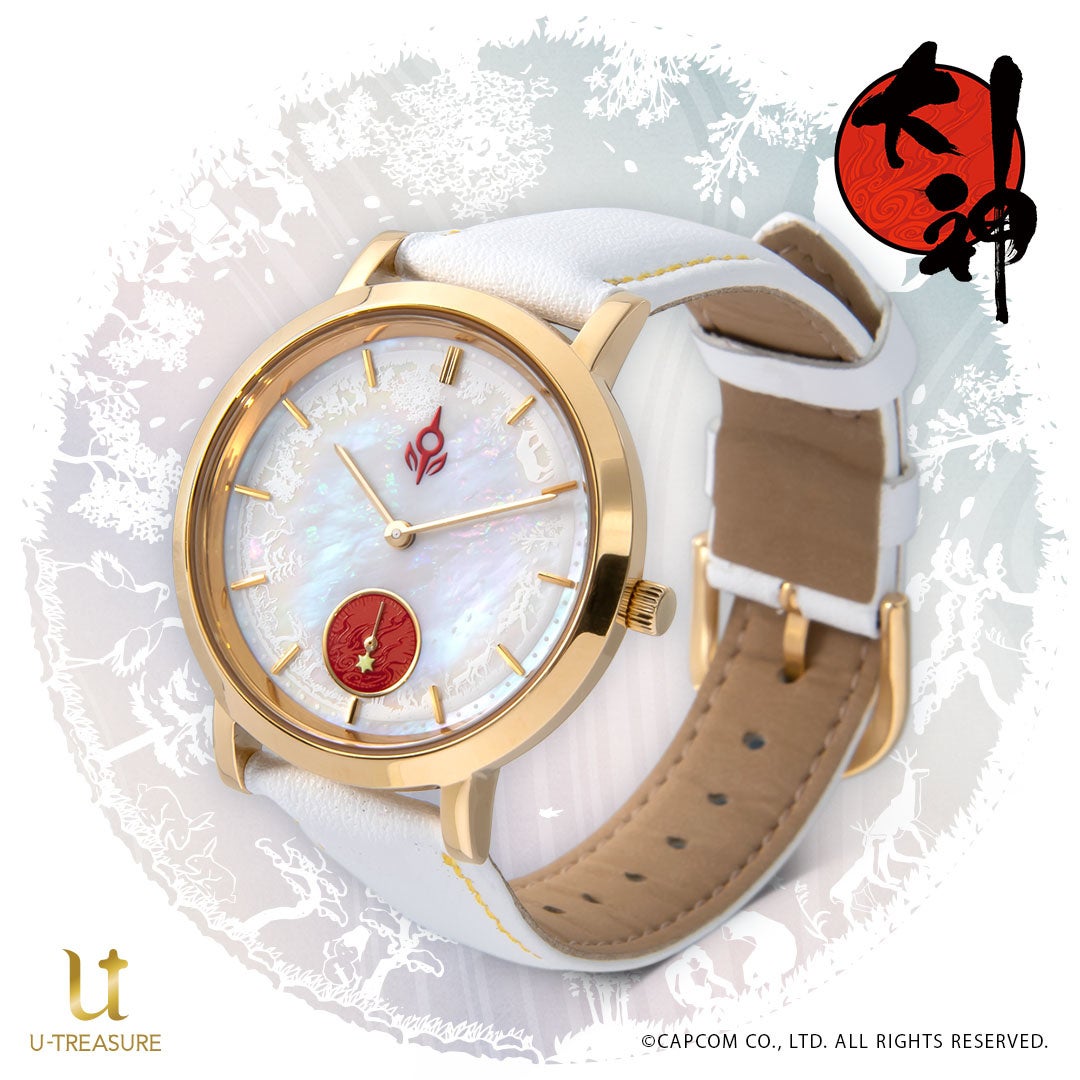 大人のための本格的なキャラクタージュエリーを扱うユートレジャー(東京都豊島区:代表取締役:伊藤 崇史)は、株式会社カプコンのネイチャーアドベンチャーゲーム『大神』とのコラボ第四弾として、腕時計を3月3日(木)~3月31日(木)の期間限定で予約受付を行ないます。このたびの新作は、白蝶貝を使用した文字盤に四季の移り変わりを連想させるデザインを取り入れ、白色を基調に大神の美しい世界観を表現した腕時計です。インデックスの12時位置やスモールセコンドは「アマテラス」のモチーフ、秒針は蓄光仕様になっており、暗闇で光る様子が「イッスン」を思わせます。デザイン監修及び造形監修は『大神』のキャラクターデザインを担当した「吉村健一郎」氏が行い、熟練した時計職人が細部までこだわり製作しました。ユートレジャーコンセプトストア池袋、ユートレジャーオンラインショップにて取り扱います。