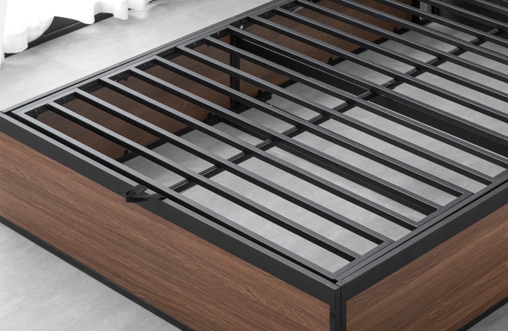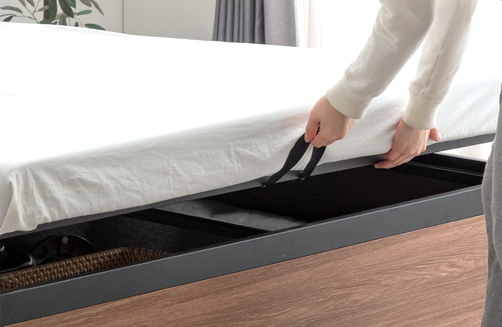 床板を持ち上げて開閉するため、引き出しを引くための余分なスペースを確保する必要がなく、ベッドの設置面積だけで大容量の収納スペースを確保することが可能です。