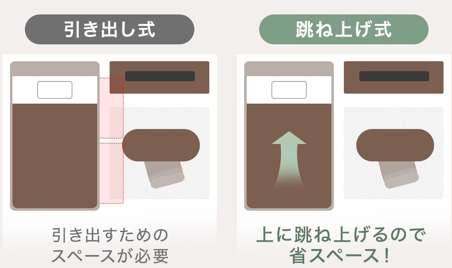 本製品の収納部は、一般的な引き出しタイプとは異なる「跳ね上げ式」を採用しております。