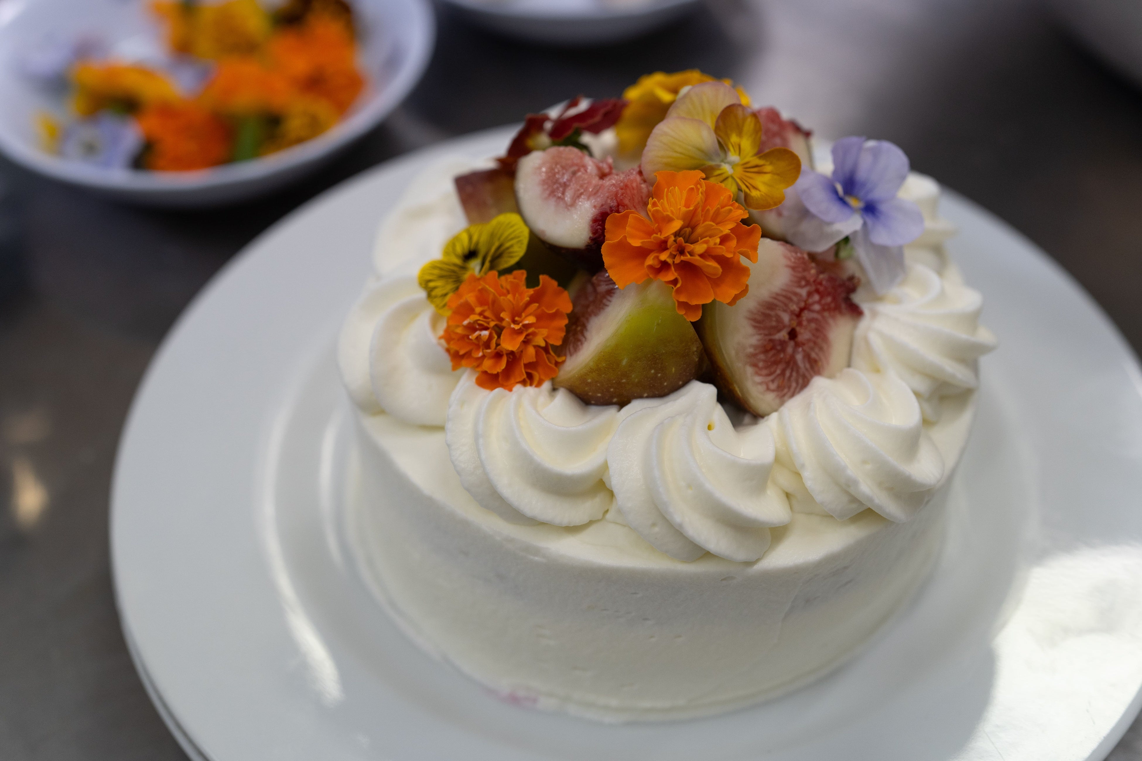 教室では、「THE GATEHOUSE」の八木シェフと岩田パティシエが講師を務め、愛知県産のイチジクや津島市周辺で栽培されているローゼル(アオイ科の植物)、エディブルフラワー(食用花)といった地元の食材を使用しました。子供たちが普段の授業で学んできた「地産地消」にフォーカスし、フードマイレージ削減(輸送によるCO2排出量の削減)や食品の鮮度、顔の見える生産者さんとの繋がりや一次産業を地域で支える意識についても説明されました。児童たちは、ローゼルの収穫体験をしたり、食べられるお花など初めて触れる食材に驚きを見せながらも、自分たちの住む地域の食材について学び、楽しみにしていた生クリームのコーティングやデコレーションに熱心に取り組みました。