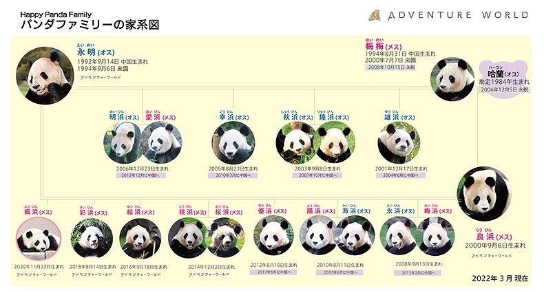 アドベンチャーワールドで誕生した初めてのジャイアントパンダ。2008年に初めてふたごの赤ちゃんを出産。日本生まれのジャイアントパンダが日本で出産するのは初めてのことでした。その後も7回の出産で10頭の赤ちゃんを出産し、母親「梅梅(めいめい)」に負けないくらい子育て上手なお母さんパンダになりました。