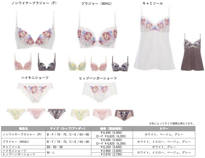 デザインのインスピレーションは、今シーズンのトリンプブランド全体の着想源でもある「生け花」。デルフィニウムやアジサイ、マーガレットなどをフラワーアレンジメントのように組み合わせました。2型のブラジャーは、バストをすくい上げるカップサイドのハリ感メイクシートⓇと、下から押し上げる3Dソフトパッドの併せ技で、ふっくらとしたデコルテとまあるいバストをメイク!サイズ展開が拡大してより多くの方にお着けいただけるようになったノンワイヤーブラジャー(P)と、ワイヤー入りのブラジャー(WHU)からお選びいただけます。