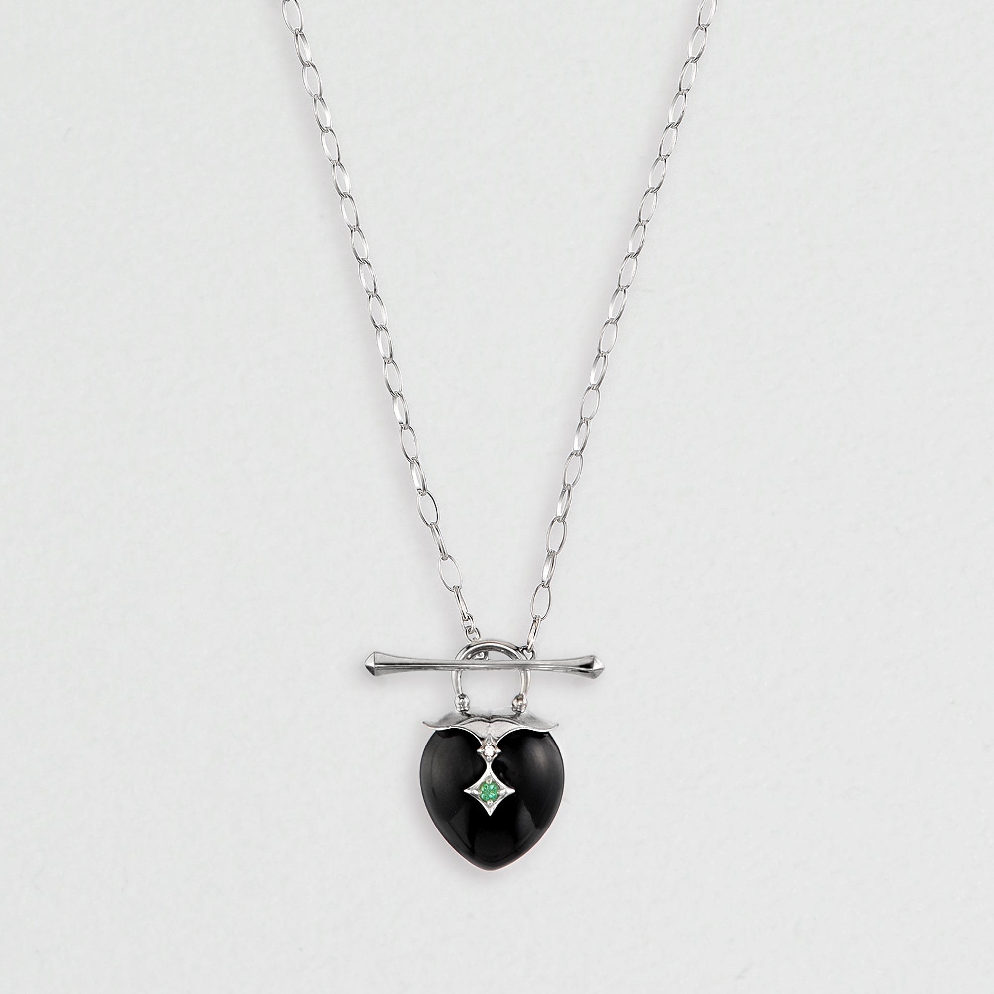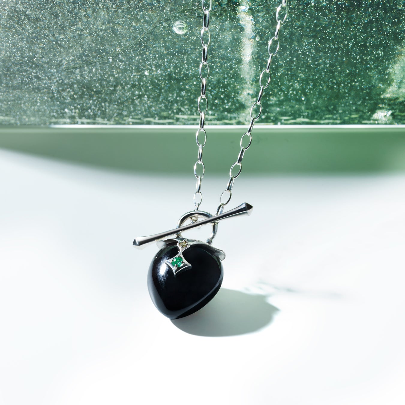丁寧に磨き上げた漆黒のブラックカルセドニーに、新緑のような瑞々しいエメラルドと、4月の誕生石であるブラウンダイヤモンドをセッティング。