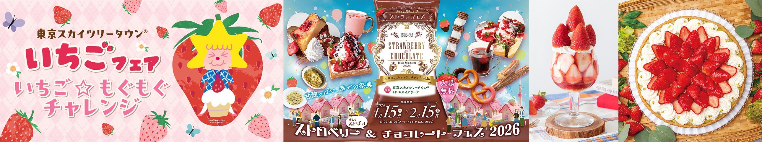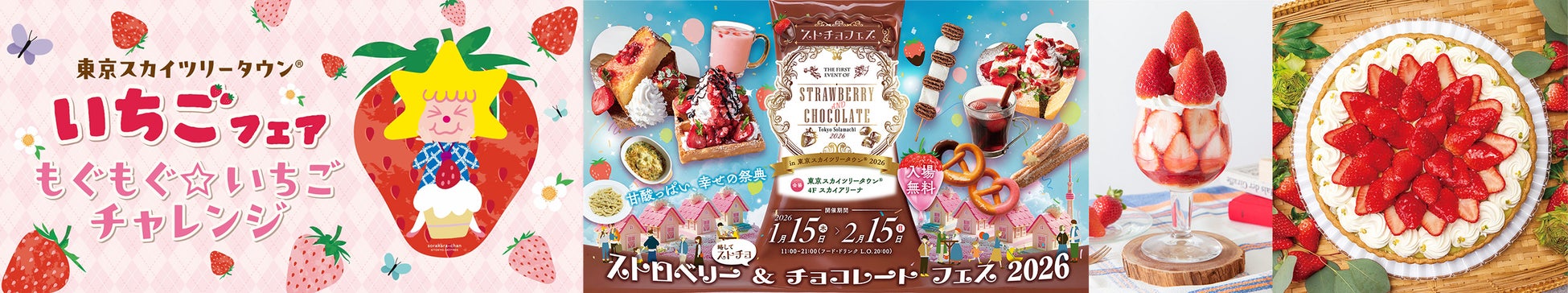 東京スカイツリータウンでは、2026年1月9日(金)~3月1日(日)の期間、大人気の「東京スカイツリータウン(R) いちごフェア」を開催します。今回は、過去最多の約90店舗が参加します。そして、初開催のいちごの早食い競争「もぐもぐ☆いちごチャレンジ」や、冬シーズン初開催の屋外グルメイベント「STRAWBERRY AND CHOCOLATE TOKYO Solamachi® 2026」など、様々なイベントを開催します。パワーアップした東京スカイツリータウンのいちごフェアをお楽しみください。